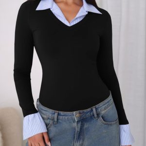 Womens Long Sleeve Polo Shirts Business Casual Work Tops Slim Fit V Neck Collared Patchwork Fall Outfits