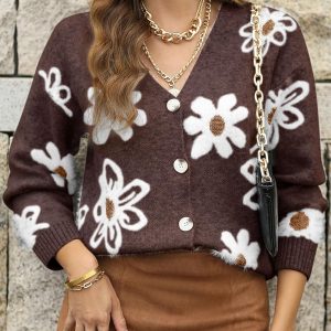 Cardigan Sweaters for Women Open Front Long Sleeve Button Down V-Neck Knit Floral Sweater