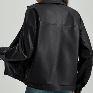 Faux Leather Jacket Women Motorcycle Zipper Bomber PU Bike Coat with Pockets