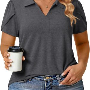 Plus-Size-Summer-Tops for Women Casual Collared V Neck Polo Shirts Business Tunics Trendy Petal Short Sleeve Blouses