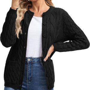 Women Cable Knit Cardigan Sweater Crew Neck Button up Cardigan with Pocket Sweater Coat for Fall and Winter