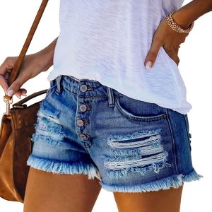 Women Ripped Denim Jean Shorts Mid Rise Summer Hot Raw Hem Casual Shorts